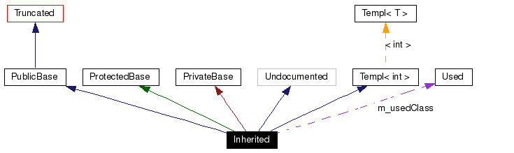 /*! Invisible class because of truncation */ class Invisible { }; /*! Truncated class, inheritance relation is hidden */ class Truncated : public Invisible { }; /* Class not documented with doxygen comments */ class Undocumented { }; /*! Class that is inherited using public inheritance */ class PublicBase : public Truncated { }; /*! A template class */ template<class T> class Templ { }; /*! Class that is inherited using protected inheritance */ class ProtectedBase { }; /*! Class that is inherited using private inheritance */ class PrivateBase { }; /*! Class that is used by the Inherited class */ class Used { }; /*! Super class that inherits a number of other classes */ class Inherited : public PublicBase, protected ProtectedBase, private PrivateBase, public Undocumented public Templ<int> { private: Used *m_usedClass; };
